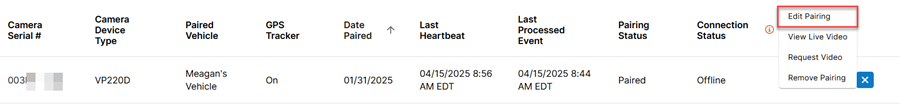 Locate the unit with the camera that you would like to turn tracking on/off for. Then, click the ellipsis menu > Edit Pairing.