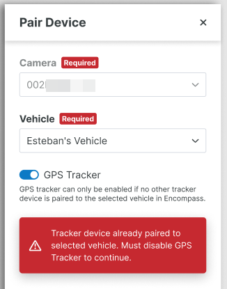 NOTE: Only one tracking device can be assigned to an Encompass unit at a time. Therefore when adding/editing a vehicle/camera pairing, you may encounter an error indicating that a tracker device is already paired to the selected vehicle. To proceed with saving the pairing, disable the GPS Tracker toggle. To proceed with camera tracking for this vehicle, the non-camera tracker will need to be removed from the vehicle in Encompass first (see Encompass Guidance for Vehicle Tracking).