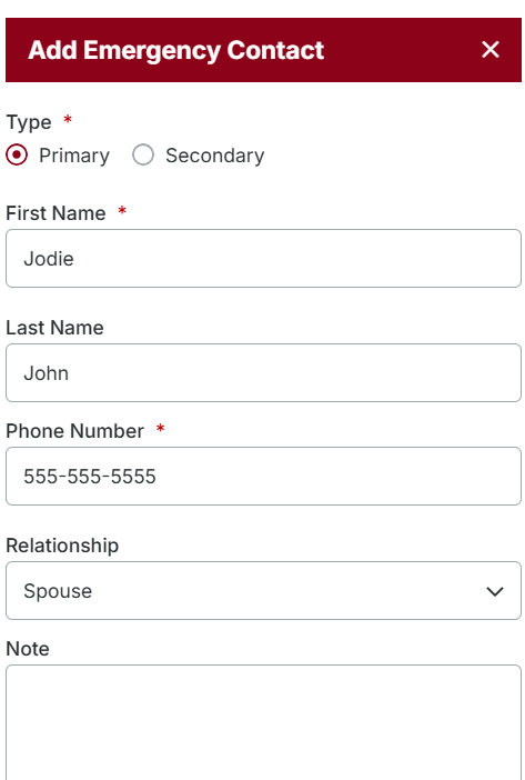 Add Emergency Contacts for the Driver. You can indicate whether they are Primary or Secondary Emergency Contacts. You can have multiple Emergency Contacts for a Driver but be sure to select which is the Primary when adding multiple Emergency Contacts.