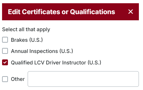 Add any applicable Certificate or Qualification information for the Driver.