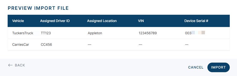 - It isn't required that you assign a driver, location, or camera via the template. You can update those after the vehicle import if desired. (See Assign Driver to a Vehicle, Managing Locations, or Pairing and Unpairing a Camera to a Vehicle for more information.)